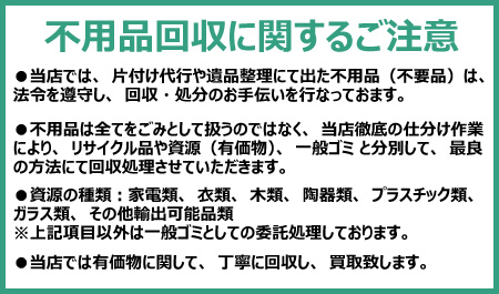 秋田市で不用品回収、大型ごみ・粗大ゴミ処分を24時間迅速に対応致します。 秋田市 井川町 羽後町 大潟村 大館市 男鹿市 潟上市 鹿角市 上小阿仁村 北秋田市 小坂町 五城目町 仙北市 大仙市 にかほ市 能代市 八郎潟町 八峰町 東成瀬村 藤里町 美郷町 三種町 湯沢市 由利本荘市 横手市その他近郊の市町村も可能です! アパートマンション一軒家どんな場所でもどんなものでも回収処理いたします。 お気軽にご相談ください。